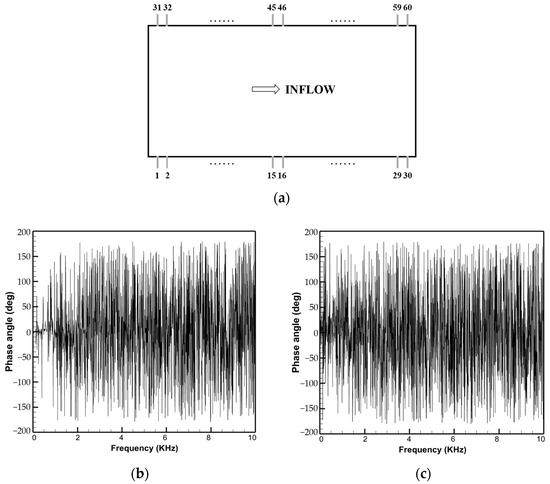 As described in Section 3.1.2, the sound field correlation should be discussed before using the reference microphone method. Using Michalke’s method, the microphone signals of the three positions 1/30/45 and 15/31/60 are used as an example (the microphone order is shown in Figure 9a and the phase distribution of the cross-correlation function is shown in Figure 9b,c). It can be seen that the phase angle changes drastically below 10 KHz, which means the turbine wake interaction broadband noise is essentially uncorrelated and the reference microphone decomposition method can be used here.