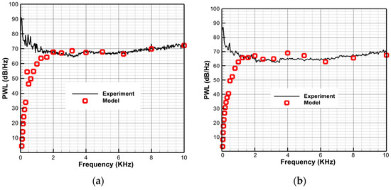 Figure 10 compares the PWL (sound power level) between the RI-TP model prediction results and experimental results at the designed and the off-designed rotation speed. Below about 2 KHz, the difference between the modal and experiment data are mainly due to the dynamometer’s shaft which directly connects to the rotor shaft. A slight misalignment between the two shafts themselves and the junction of the two shafts can lead to background noise. Moreover, such background noise is proportional to the operating power. Unfortunately, since the test rig cannot lock the rotational speed, the effects of this background noise cannot be removed. As a result, the frequency range between 2 KHz and 10 KHz is effective.