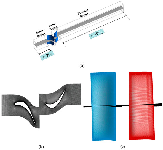 Computational domain and local mesh of NPU-Turb for DDES: (a) Computational region; (b) Mesh in meridian plane; (c) Mesh on blade surface.