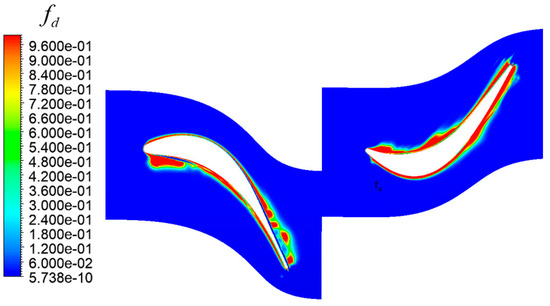 Figure 11a shows the computational domain, in which the extended region is to make the smooth transition from fine mesh around the blade to course mesh at the outlet. A structured grid is applied in all domains and the total nodes numbers is about 27.65 million. Figure 11b,c respectively, gives the local mesh around the blades at the meridian plane and on both blade surfaces. Figure 12 gives the distribution on the rotor surfaces, which indicates that the mesh in the normal blade surface is enough to capture noise source information. And the of the switch function is shown in Figure 13. The blue region is the LES region.