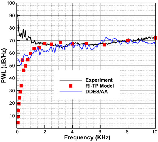 Figure 14 compares the PWL of the turbine wake interaction noise among the RI-TP model prediction results, the experimental data and the DDES/AA hybrid model prediction results at the designed rotation speed. On the one hand, the consistency of the three methods in spectrum prediction in the 2 KHz~10 KHz range further validates the accuracy of the RI-TP model. On the other hand, that there is little difference between the RI-TP model and the DDES/AA hybrid model below 2 KHz proves the experimental data have serious ‘dirty’ noise at such a frequency range and the difference below 2 KHz in Figure 10 is not worthy of attention. As a whole, the accuracy of the RI-TP model for the turbine wake interaction broadband noise developed in this paper is sufficient to accurately predict the broadband noise spectral distribution.
