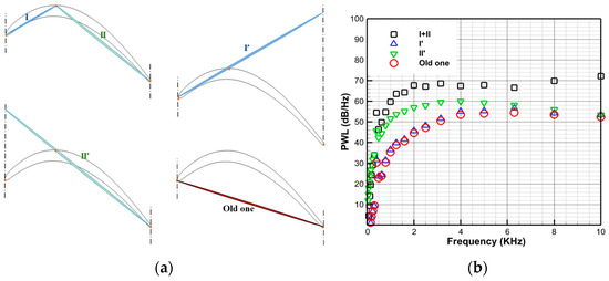 To aptly illustrate the gain in prediction accuracy from the two-flat-plate (TP) assumption, the prediction result under the old linear flat-plate assumption for turbine blade is shown in Figure 15, with the coordinate system also given in Figure 15a below. In addition, the contribution of the single extended section (I′ or II′) compared with the present ‘I + II’ has also been compared here. Figure 15b gives the prediction results in the four kinds of assumptions. It can easily be found that the present TP assumption can greatly increase PWL at most frequencies. For real turbine aero-acoustic design, there is a clear upper limit indicator for noise level. Only if the turbine noise prediction is sufficiently accurate will it be possible to know if the various acoustic mitigation strategies meet the overall requirements.