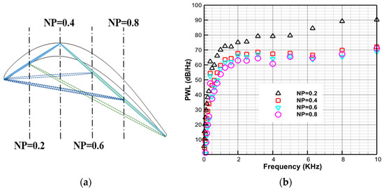 The value of NP, defined as the ratio of axial chord length of section ‘I’ to the total axial chord length , is critical in the RI-TP model, which can be seen from Equation (11). Figure 16 gives the predicted results with NP changes from 0.20 to 0.80. It can be seen that the larger the NP value, the smaller the PWL at almost all frequencies, but the trend tends to be moderate, especially at high frequencies larger than 5 KHz. Such a phenomenon can be explained by the Kernel function of the LINSUB and the changes of contribution between section I and II. When NP is small (NP = 0.2), the whole load distribution consists of little of section I and most of section II, which causes an unreal spectral distribution. Such a phenomenon does not occur for NPs > 0.4 because section I has been dominant. The effect of changes and rotor turning angle changes act as a counteract for each other. And this also indicates that section II mainly has the effect of gaining the PWL of the spectrum but the trend of spectrum distribution is dominated by section I.