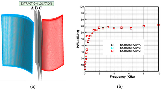 The turbulent kinetic energy and the turbulence dissipation rate in the RANS-informed model are key input parameters. The extraction location is only required at the blade leading edge but not as a clear quantitative limitation. Here, we have studied the effect of three equally spaced surfaces for the turbulent information of section I on the model prediction results. In Figure 17a, A, B and C represent the extraction surfaces located at 50%, 70% and 90% of the axial stator–rotor spacing, respectively. Figure 17b shows the results, which indicate that slight differences in turbulence information at three surfaces before the leading edge do not have a significant effect on the PWL of the RI-TP prediction result. As a result, the EXTRACTIO=C is used for all other cases.