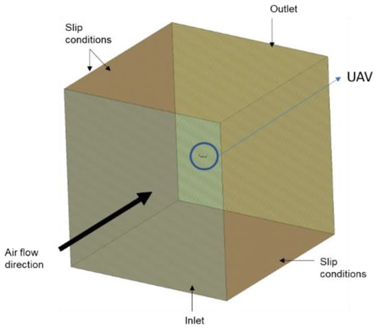 A CFD analysis was performed on the UAV to help reveal all crucial information on the lift (CL) and drag (Cd) coefficients, as well as the applied bending moments and shear forces onto the wings and structure of the drone in flight. It is a fact that the tailless design helps the reduction of parasitic drag and weight, as well as improving the stealth characteristics of the UAV. As Figure 1 depicts, the airflow direction was placed in front of the aircraft at a magnitude of 33 m/s. The slip conditions were set on the top, bottom, and side of the aircraft, while the outlet was set at the back of the aircraft.