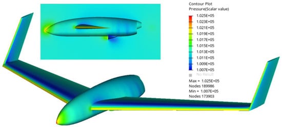 The CFD analysis revealed larger applied pressures at the tip of the aircraft and the edges of the wings, as expected. In addition, increased pressure was observed around the inlet of the aircraft. The pressure magnitude was approximately 1 atm, as indicated in Figure 4.