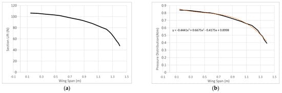 The (a) Section lift and (b) pressure distribution of the wing span (the red dashed line indicates a polynomial fit).