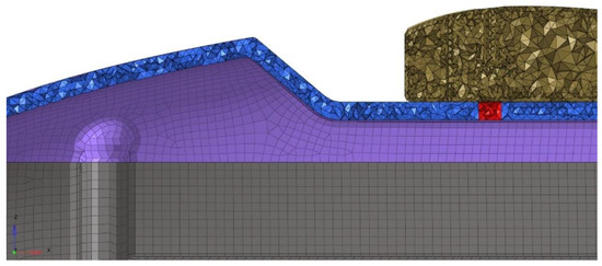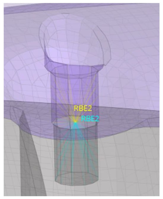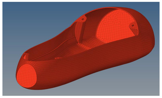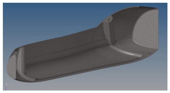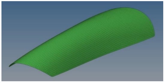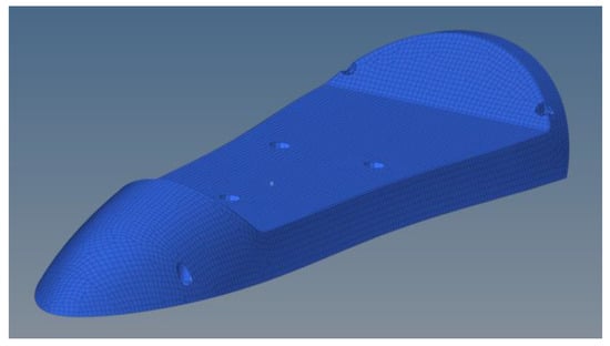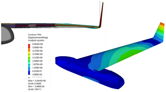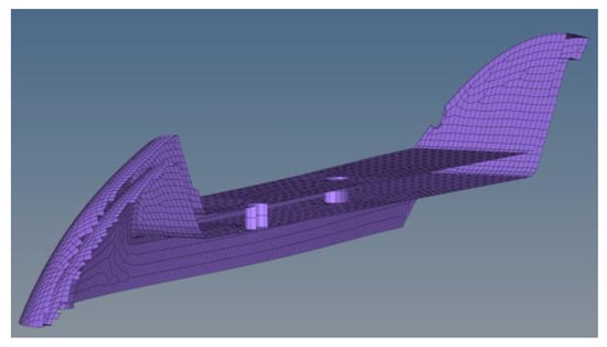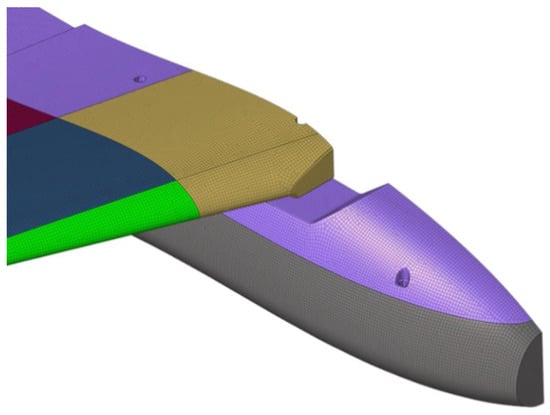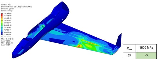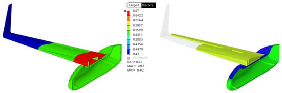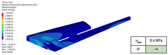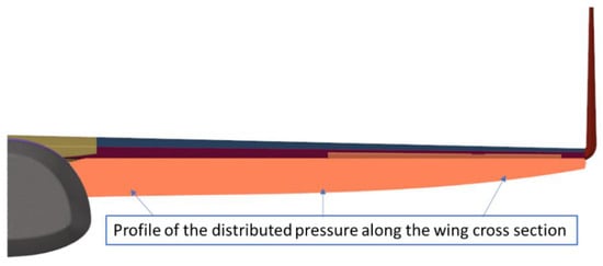 For the wings, where the pressure profile is qualitatively visualized in Figure 7, the same procedure was followed (Figure 8), with multiple load cases used, such as the distributed pressure (obtained from both the CFD and analytical studies presented in the previous section, Figure 5b) and the wings’ own weight. Finally, the boundary conditions used were as described above, through the use of the inertia relief computational technique.