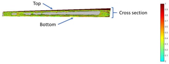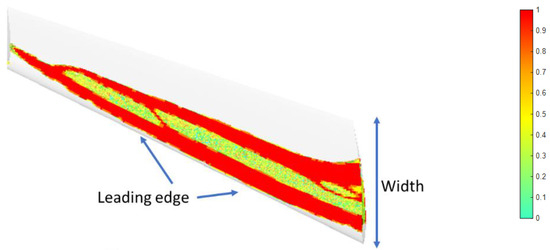 Optimized material paths for the wing. The color bar indicates the importance of material presence from 0 to 1.