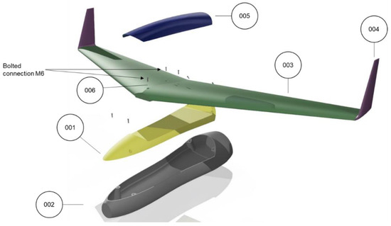 In this section the full assembly of the current drone design is demonstrated, and the structural components are listed (Table 3) and explained. In Figure 9, the preliminary structural design of the UAV is depicted. More specifically, the design philosophy is based on a large container (002), which will host the energy system, the electronics, and the first-person-view (FPV) camera. The latter will be jointed with the wings (003) through the 001 component, an intermediate structural and sturdy component. The 001 component is the main cap of the UAV. It protects the cargo, provides fast and easy access to the cargo holder for maintenance, and is connected to the wings and the cargo holder with bolts (006). The quick release cap (005) completes the aerodynamic shape of the UAV as this helps with fast refueling.