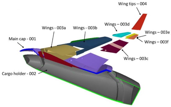 In Figure 9, the conceptual design of the UAV is depicted. Several manufacturing considerations had to be considered in order to achieve both the desired weight limit (<9 kg) and the mandatory structural integrity. The manufacturing considerations include the following: