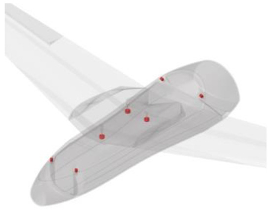 For the analysis of the fuselage, several load cases were used, such as equivalent wing loads and the weight of the drone in parked position and landing. The results are depicted in Figure 6. As expected, considering the color contour from blue to red, an excess of material is required around the housings of the wings and on the top and rear of the aircraft in order to maintain its structural integrity. The material concentration around the wing housing facilitated sturdy support conditions for the wings, as they simulated the boundary conditions of a cantilever beam. Furthermore, the prediction of material continuity on the top and rear of the drone was required as it kept the entire structure together. The wing housings acted as a shear web for the fuselage, as they bore the shear stresses developed by the wings at the fuselage sides and the bending moment, while the top and the rear parts deliver the loads arising by the weight of the fuselage and the aerodynamic loads.
