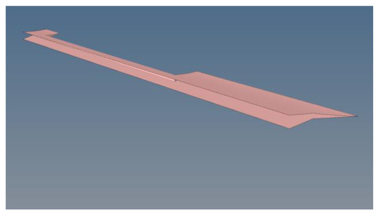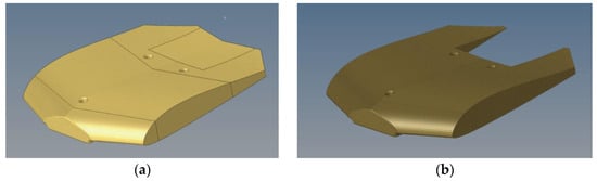 A comparative case study for the design philosophy of an aerostructure has been performed. Two different approaches have been simulated and compared as follows: (a) the proposed design of a sandwich-structured UAV body with a lay-up of ([0/90]4S/)S, and a 2 mm thickness for each face sheet and a 10 mm thickness for the foam core, and (b) the traditional spar–rib approach with I-Beam stiffeners. The airfoil is 4 mm thick with a lay-up of [0/90]8S, and the lamination for the I-Beams is [0/90]6S, with a 3 mm thickness for the vertical parts. These two different structures are excited by a distributed pressure of 10 kPa at their top surface and are clamped at their back edges. Both the structures are 1 m long, and the materials used for the UD composite and the foam core are the same as in Table 4. Their cross-sections are shown in Figure A1.