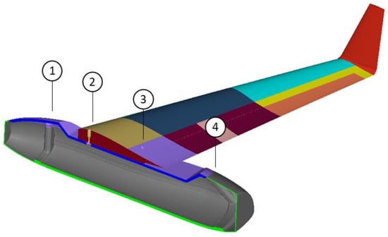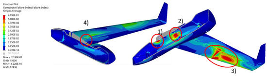 The procedure started with a free-size composite optimization analysis. The free-size optimization analysis facilitated the faster estimation of the entire UAV thickness. It also indicated which regions and which sandwich laminates of the UAV should entail only composite skin. Concerning the OF for this optimization study, the minimization of the overall stresses was set with the following constrains: (a) the mass to remain below 9 kg and (b) to maintain a symmetric lay-up throughout the thickness of the aircraft (a constraint that facilitates the manufacturability of each skin of the laminate). The loads input were as follows: (a) the final weight, namely 25 kg, (b) the distributed pressure calculated in Section 2.2 by hand calculations and CFD analysis, and finally (c) 3 g acceleration in all three directions (used separately). For optimization purposes (as a design space), the entire UAV structure was modelled as a single laminate, initially comprising several thick plies (super plies), one for each selected material, with different ply orientations. This procedure allows to identify the most appropriate plies in each area of the structure with their respective thicknesses. Figure 10 depicts the initial calculated values of the thickness laminates throughout the whole aircraft.