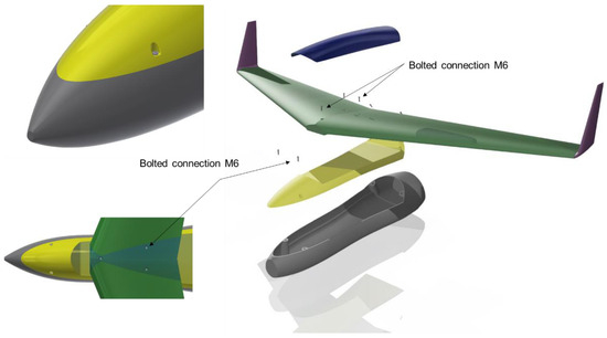 All bolted connections have been realized with the help of solid carbon patches (supporting and transmitting shear loads into the composite skin) and threaded inserts (keenserts) being inserted in the patches and skin during lamination. The low number of bolted connections would reduce the difficulties in the assembly of the whole UAV.