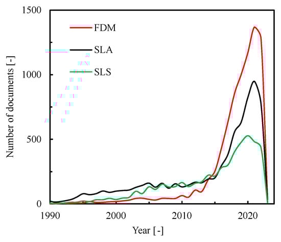 For a better understanding of the increasing applications of RP methods in aerospace engineering, Figure 1 displays the Scopus search results for the keywords “fused deposition modelling”, “stereolithography”, and “selective laser sintering” (accessed on 5 November 2022). As shown in the figure, research in all three methods has gained momentum in the last decade owing to the increased application of the RP process in various areas. It is worth mentioning that recently the FDM method has shown a relatively higher number of publications than the other two methods.