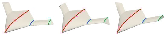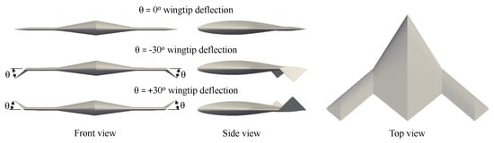 This work investigates the low-subsonic aerodynamic characteristics of a cranked lambda wing UAV planform, which is less seen in the literature, particularly for weaponized flying wing versions such as the X-47B planform [21], which is designed to perform in the complex flow conditions of aircraft carrier-based operations [22,23]. It offers various advantages such as lower observability, higher lift-to-drag ratio, and ability to sustain higher g-loads than piloted fighter aircraft. The selected planform incorporates a wing-body concept and a swept constant chord section for the inboard and outboard sections, respectively. This combines the aerodynamic advantages of a non-slender leading edge (LE) (sweep angle Λ L E ≤ 55°) and slender LE ( Λ L E > 55°) wing models [24]. The wings with different LE sweeps produce multiple LE vortices that interact with each other and enhance the aerodynamic performance compared to single LE vortices [25]. However, this configuration exhibits challenging aerodynamic behavior due to a complex nonlinear flowfield, such as mixed attached/separated flow, multiple interacting vortices, and vortex breakdown, which affects the aerodynamic stability and control significantly [25,26]. Hence, an elaborate aerodynamic performance investigation of this configuration is required to understand the generated complex vortical flow structures. On the other hand, low-speed aerodynamic characteristics of the swept wings are critical for take-off and landing regimes where tip separation occurs. The tip separation adversely affects the pitching moment, thereby reducing the aircraft’s stability and control [27]. To overcome this issue, various passive and active flow control methods are used [27]. In the present study, the planar and nonplanar concept (wingtip deflections) with smooth wingtip deflections, to avoid surface gaps on the present cranked lambda UAV model, was investigated within the framework of the NATO AVT-SP-002 project titled “Turbulence and the Aerodynamic Optimization of Nonplanar Lifting Systems” in collaboration with the University of Glasgow and Istanbul Technical University. The wingtip deflections indicate a planar configuration for 0° deflection and nonplanar configurations for downward and upward deflections of −30° and +30°, respectively (Figure 2). Low-speed wind tunnel tests of the models are conducted to evaluate aerodynamic loads, and the tuft flow visualization method is used to capture the instantaneous flow pattern. Furthermore, aerodynamic characteristics and flow features are also obtained numerically from OpenFOAM 8.0 to provide a comparison with experimental data and aid in detailed flow visualization.