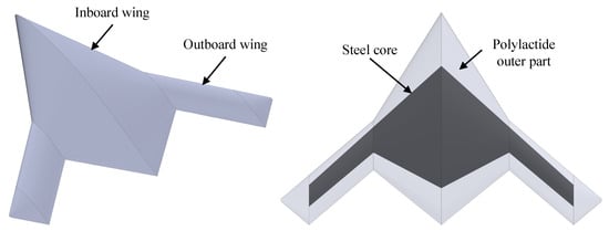 The hybrid UAV model comprises two main parts, the outer mold line made from PLA and a steel core to strengthen the model for wind tunnel testing, as seen in Figure 3. The geometrical specifications of the UAV model are provided in Table 2 [28]. The wind tunnel model should be strong enough to withstand the aerodynamic loads generated due to the incoming airflow. The resultant lift and drag forces act normal to and along the airflow, respectively. They depend on the pressure distribution of the model corresponding to the angle of attack (AOA). The drag forces increase significantly after the critical AOA due to the stall condition. The common types of stresses experienced by the wind tunnel model are tension, compression, shear, bending, and torsion. Moreover, the model must be structurally rigid to retain its aerodynamic shape, even under extreme loading, to obtain satisfactory results.