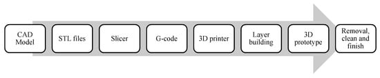 Figure 5 shows the various steps involved in the FDM process. Firstly, the CAD model to be 3D printed was generated using a CAD modeler and then exported as STL files. The STL files represent the CAD model as a triangulated surface and they require higher resolution (increased number of triangles) for accurate surface approximation. However, increasing the resolution of STL files increases the file size and processing time. The STL files were sliced with an open-source slicing software (PrusaSlicer 2.4.2 [30]), which was used to manipulate the 3D model and produce 2D horizontal slices with a thickness of 0.6 mm, as shown in Figure 6. The slicing step transforms the geometric information of the 3D model into the machine language G-code (PrusaSlicer G-code [30]) that contains instructions for the printer. The G-code loaded into the printer allows the printer head movement to be encoded in the X, Y, and Z directions to position the printhead during printing. The machine parameters affecting the printing quality are the nozzle temperature, diameter, bed temperature, filament type, size, and the build printed volume shape. The slicing software parameters such as model position, support structure, raster angle, width, layer height, and build orientations affect the built part quality. The build orientation dictates the tensile strength and time to make the 3D-printed model. Moreover, the support structures are the expendable parts created to enhance the performance and build quality of the printed model. During printing, they help to overcome difficulties such as overhang, internal cavities, thin-wall sections, etc.
