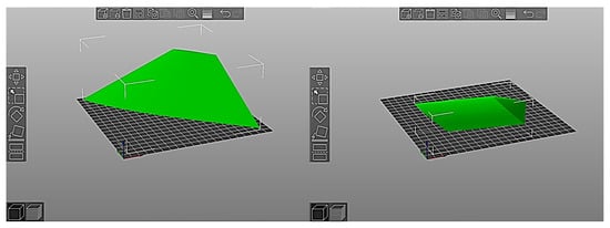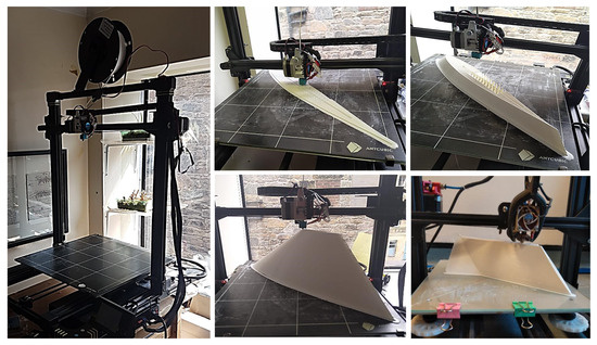 An Anycubic Chiron 3D printer with a Cartesian coordinate system was used, with a maximum part size of 400 mm × 400 mm × 350 mm, and the printing was performed with a 0.6 mm diameter nozzle (Figure 7). The machine drive wheel pulls the PLA filament roll (solid thin-filament raw material–thermoplastic polymers), extrudes it through a heat-controlled nozzle head to reach a semi-liquid state, and deposits it on the heat bed or a layer that is previously printed, where it solidifies at room temperature after printing. After the layer is built, the platform on which the component is mounted drops as the working head continues to deposit material to create the next layer. The next extruded layer will fuse with the bottom layer and continue to fuse until the required dimensions of the design model are obtained. The thermoplasticity influences the ability of the filament to bond layers during the printing and solidification processes. The equipment deposits semi-melted thermoplastic in a directional way that results in parts with anisotropic behavior. The advantage of using the FDM process is that it is clean, environmentally friendly, and simple to use.