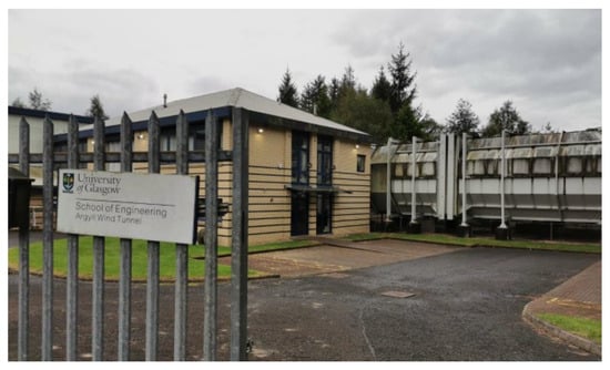 The present experimental investigation was performed to obtain the aerodynamic characteristics of a UAV model. The aerodynamic load measurements and the tuft flow visualization tests were conducted in the de Havilland low-speed wind tunnel facility at the University of Glasgow (Figure 9) [31]. It is a closed -return atmospheric low-speed wind tunnel with a maximum speed and Reynolds number (Re) of 70 m/s and 4 × 10 6 , respectively. The inlet turbulence intensity of the wind tunnel is less than 1%. The full test model can be mounted on a sting that adjusts the incidence and roll angle, whereas the turntable adjusts the yaw angle (Figure 10). Moreover, for the half model, the turntable yaw controls the incidence angle. The wind tunnel can be operated and remotely controlled from the control room. It has a filleted octagonal cross-section with a contraction ratio of 5:1, which increases from inlet to outlet. The octagonal cross-section offers various advantages such as a thinner boundary layer, reduced pressure loss across the contraction, and more uniform axial velocity distribution compared to other shapes, such as circular and square cross-sections [32,33]. The dimensions of the tunnel test section are 2.65 m × 2.1 m × 5.4 m and a platform of 6-axes load cells is located underneath the test section. Figure 11 shows the model installation in the wind tunnel test section.