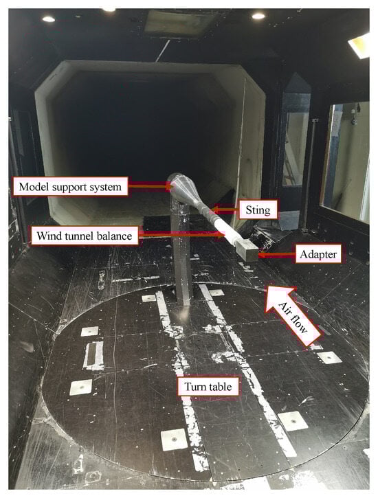 In the present test, the model’s center of gravity was not located on the balance moment center, and the model weight affected the internal force balance components during the model rotation; hence, weight tare correction was required to improve the final accuracy of the obtained experimental results. The weight tare measurements were taken using corresponding wind-off data with closed doors for the entire AOA range. Then, the forces and moments were collected using corresponding wind-on data. The weight tare values were subtracted from the balance data, and the balance forces and moments were transferred to the required center of gravity location on the model. The forces measured by the six-component force balance were in the body-axis frame of reference and converted into the stability-axis frame of reference. Furthermore, the aerodynamic loads were nondimensionalized to obtain the lift, drag, and pitching moment coefficients.