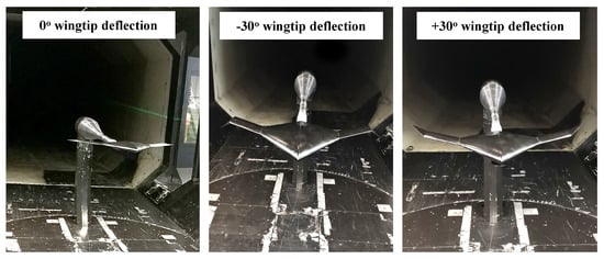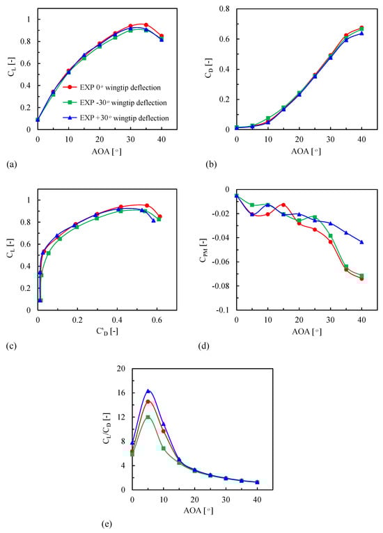 Figure 15b displays the variation in C D against AOA for the three models. The drag increases with the AOA for all models. The −30°-wingtip-deflection model exhibits higher drag at a 10° AOA due to flow separation. Moreover, the −30°- and +30°-wingtip-deflection models reduced the relative average C D by 0.16 and 4.27%, respectively, compared to the planar model.