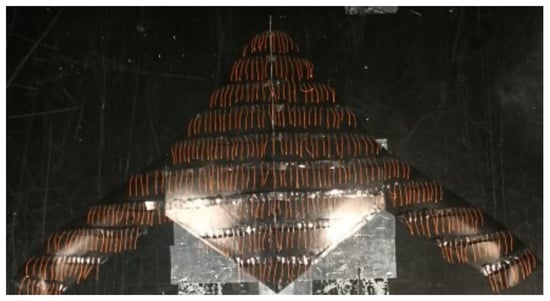 The procedure outlined above was duplicated for the flow visualization experiments, except that the data acquisition system operator served as the camera operator rather than recording balance data. The tufts were placed at certain spanwise positions on the suction surface (SS) of the wing [35,36,37], using adhesives such as clear glue and tape, and firmly secured so as not to be blown off the model (Figure 12). It should be noted that the tape attained a balance between adhesive strength and thickness. It was strong enough to stay on during wind tunnel tests and thin enough not to change the wing’s surface drastically. The material used for the tufts was neon orange sewing thread and the tufts were cut to an appropriate length so as not to affect the flow.