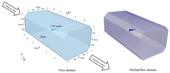 OpenFOAM 8.0 [38] was used to perform numerical simulations to determine the aerodynamic characteristics of the UAV models. OpenFOAM provides various solvers, and due to the assumption of steady and incompressible flow in the present problem, the SimpleFoam solver was chosen. For the turbulence closure, the two-equation k– ω shear stress transport (SST) model was selected. Second-order accurate schemes were applied for the spatial discretization. The residual convergence criteria were set to 10−6. The pressure was under-relaxed by a value of 0.3, whereas all other variables were under-relaxed by a value of 0.7 to improve the convergence of the simulation.