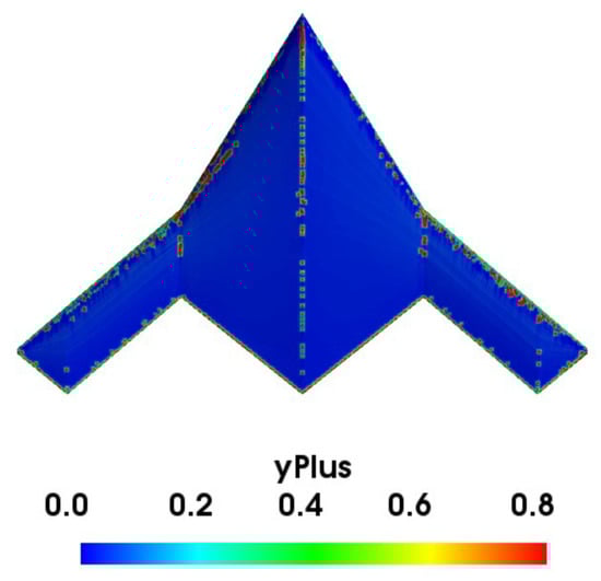 Resolving near-wall physics is essential to predict the lift and drag values accurately. Hence, ten prism layers were grown on the wing surface with a layer growth ratio of 1.05. Lastly, checks were completed to ensure that the wall y+ value was maintained at less than one (Figure 14) and that critical parameters such as skewness, aspect ratio, non-orthogonality, etc., were within acceptable limits.