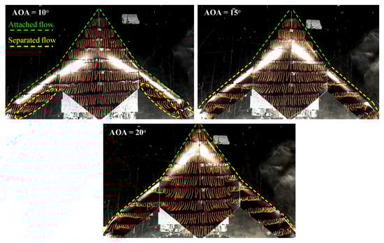 Photos and videos recorded during the wind tunnel tests were also taken for analysis and comparison, as shown in Figure 16. At AOA = 10°, the tufts are uniform and oriented along the flow direction as there is no separation over the inboard and outboard wings. However, an unsteady and erratic motion of the tufts indicates regions of flow separation over the trailing edge (TE) of the outboard wing. Conversely, at AOA = 15°, the tufts experience higher fluctuations due to flow separation over the outboard wing, whereas the flow is still attached over the inboard wing. Furthermore, for a higher AOA (=20°), the tufts located in the outboard wing experience severe fluctuation due to flow separation, and this extends toward the inboard wing, which is shown by tuft oscillation near the kink region. The green and yellow dashed lines overlaying the images indicate the areas of the attached and separated flow, respectively.