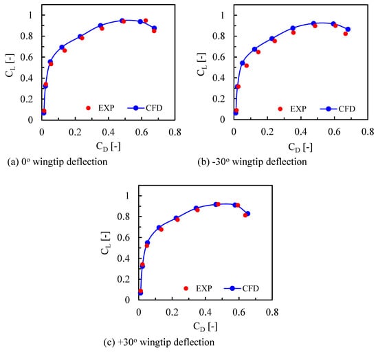 The increase in C D is more prominent for the −30°-wingtip-deflection model compared to other cases, where C L values greater than 0.3 are associated with increased flow separation. Furthermore, all models show increased C D for C L greater than 0.51 due to flow separation. It is noteworthy to mention that the −30°-wingtip-deflection model shows higher averaged C D compared to other models.