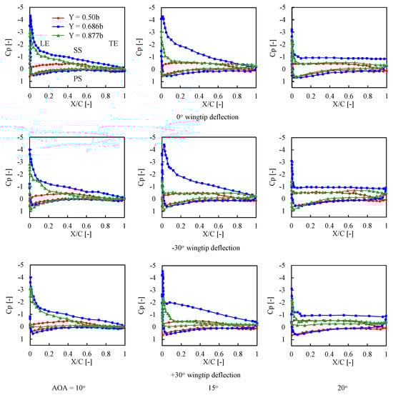 Surface pressure distributions were computed at different spanwise locations along the non-dimensional chordwise distance. Comparisons of the wing model pressure coefficient ( C p ) distribution of planar (0° wingtip deflection) and nonplanar (−30° and +30° wingtip deflections) configurations at three spanwise stations (Figure 18) for selected moderate-to-high AOA values (10°, 15°, and 20°) are presented in Figure 19. A similar pressure distribution is observed for both planar and nonplanar UAV wing configurations at station Y = 0.50b for various AOAs. Furthermore, a small increase in the suction pressure occurs with an increase in the AOA for all models. At station Y = 0.686b, for a 10° AOA, a higher suction is visible, and with an increase in AOA (=15°), the C p curve area that signifies the lift force increases for all cases. However, with a further rise in AOA (=20°), a reduction in suction pressure is visible for all cases due to flow separation. The C p distribution for station Y = 0.877b provides the flow behavior near the tip region. The pressure on the LE of the pressure surface (PS) is higher for the −30°-wingtip-deflection model than the 0°- and the +30°-wingtip-deflection cases. Furthermore, an increased AOA reduces the LE suction due to increased flow separation for all cases. It is found that the 0° and −30°-wingtip-deflection models exhibit higher and lower LE suction pressure, respectively, for all AOAs. Moreover, the C p curve area of the +30°-wingtip-deflection model is less than that of the other configurations. Further comparisons of streamlines colored by velocity magnitude are shown in Figure 20, Figure 21, Figure 22, Figure 23, Figure 24 and Figure 25.