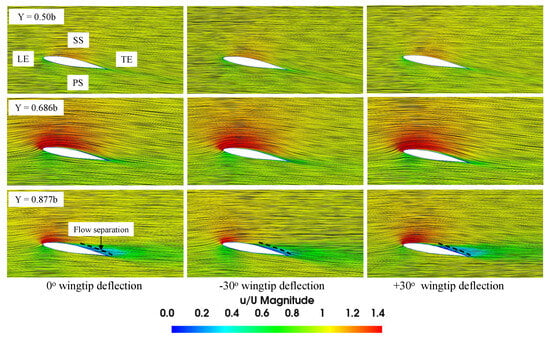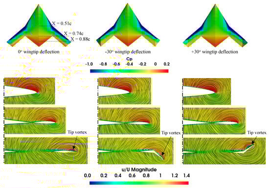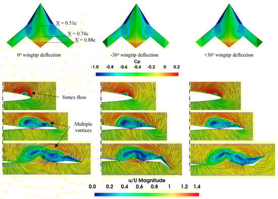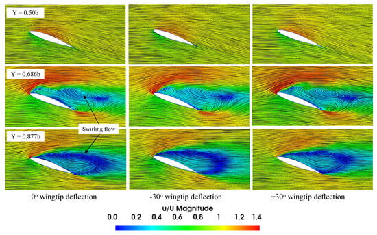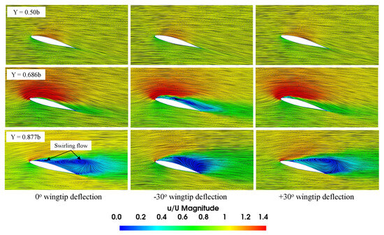 Figure 20, Figure 21 and Figure 22 illustrate streamlines colored by velocity magnitude at different spanwise stations for all models. At a 10° AOA and spanwise sections 0.5b and 0.686b, streamlines show attached flow with a minimum disturbance at the TE for all cases. However, flow separation is visible on the wingtip section (0.877b) for all models. At a 15° AOA, the streamlines illustrate smooth and regular flow patterns at the symmetry plane (0.5b) for the three configurations. However, streamlines demonstrate disturbed flow patterns at the 0.686b section, which is more apparent with the −30°-wingtip-deflection case. Moreover, the flow separation from the wingtip results in swirling formations at 0.877b for all cases. With a further increase in AOA (=20°), the flow separation region expands, and a large part of the separation vortex moves away from the model’s chord to the wake at the 0.686b and 0.877b sections for all models.