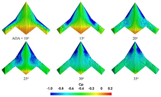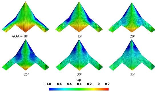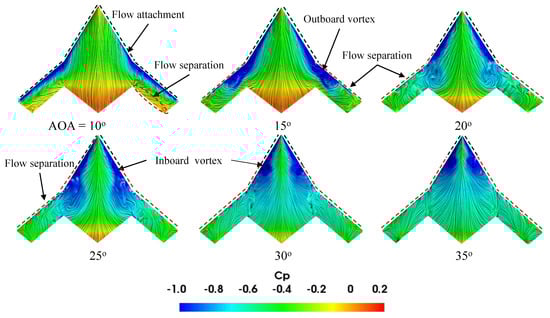 Figure 26, Figure 27 and Figure 28 show the flow topology change using the C p distribution and wall-shear streamlines on the upper surface of the model at various moderate-to-high AOAs. At a 10° AOA, there are higher suction regions on the LE, with a moderate degree of suction at the mid-outboard and the central part of the wing. Also, the wing TE exhibits higher pressure. At a 15° AOA, the suction pressure region shifts to the inboard section while most outboard sections experience stall. The outboard vortex moves inward, whereas the inboard vortex shifts outward, and their interaction increases with the increase in AOA due to the growth in their sizes and strengths. The vortices lose intensity as they move downstream towards the TE, and as a result, the suction is higher at the apex region and decreases along the chordwise direction. The suction pressure and the outboard vortex strength reduce, and the vortex breaks down for AOAs higher than 15°. In contrast, the suction and inboard vortex strength increase, breaking down at AOAs greater than 25°.