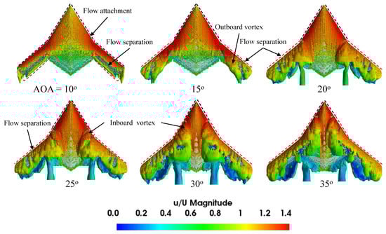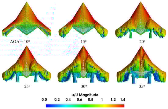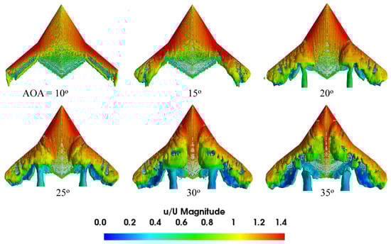 Figure 29. The iso-surface of Q-criterion (=35,000 s−2) colored by velocity magnitude for 0° wingtip deflection at various AOAs.