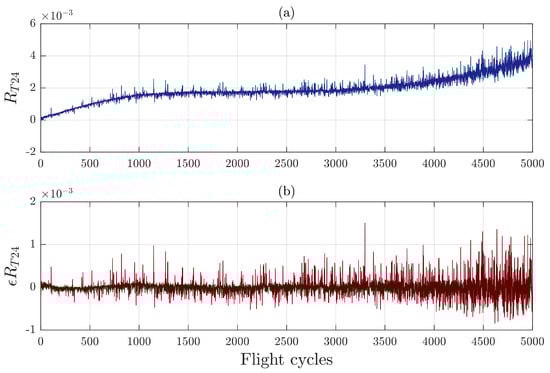 In other studies using ProDiMES [21,23,25], CFAM was employed to diagnose faulty engines during a short time (approximately 50 flights). The model conserved its accuracy, as the deterioration level was constant within this interval. However, this approach is not suitable when applied to long operation times, as engine deterioration changes considerably over time. This affects the accuracy of CFAM and quality of the residuals, resulting in incorrect fault diagnostics. Figure 1 depicts the baseline model’s inadequacy with progressive deterioration. Figure 1a shows the residuals R for a temperature variable Y (T24—low-pressure compressor outlet, Table A2) and 5000 flight cycles of an engine, while Figure 1b displays the corresponding random errors or uncertainties . Although a performance degradation trend (an increase in the temperature) is correctly captured by the residuals, the errors grow as time passes and are more evident at the final stage of the engine’s life. This problem arises because the influence of the operating conditions on the measured variables of the degraded engine is increasingly different from the influence of the baseline model, with constant coefficients producing a less accurate model for computing residuals. This is important because the signals produced by an unavoidable and progressive deterioration in the machinery can be confused as fault signals, and vice versa, especially in aged engines.