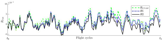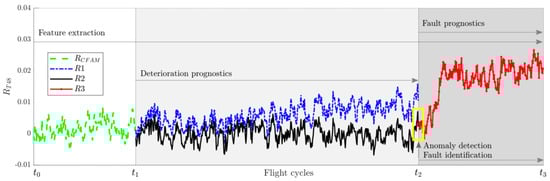 Figure 2 displays an example of the system as a function of flight cycles t, showing the behavior of the residuals for a temperature variable (—temperature at high-pressure compressor outlet, Table A2). The total interval of the engine performance analysis () is partitioned into three intervals:
