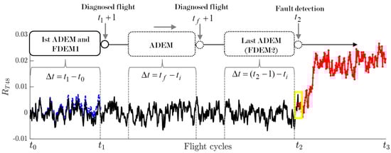 Figure 3. Behavior of (FDEM1), (1st ADEM), and residuals in Interval 1. - Interval 2 (). FDEM1 is computed at , and does not change throughout the entire second interval. Residuals and begin to separate from each other after due to the deterioration growth captured by residuals (manifested, for example, by the increase of temperature). The deterioration prognostics algorithm receives these last residuals to train a deep neural network and forecast the deterioration behavior.As for residuals , the first ADEM is also obtained at , then the model coefficients are constantly renewed by shifting the measured variables and operating conditions according to the currently diagnosed flight using the interval that precedes it. The optimal number of required flights is selected based on the model’s accuracy after testing different values (in this paper, ). Because each update involves the last flights, ADEM is always adapted to the current level of engine deterioration, producing an adequate reference function in the computation of residuals . The model stops updating at after a fault is detected by the anomaly detection and fault identification algorithm. From the start of engine monitoring, this algorithm needs a pretrained neural network with CFAM-based residuals in order to recognize a variety of fault classes, including healthy cases. Figure 4 schematizes how the FDEM and ADEM are created over time from to .
