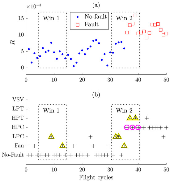 Figure 5 better explains the third detection rule for an interval of 50 flights, analyzing three occurrences within a ten-flight window. The engine is under fault-free operation in the first 35 flights, with a fault occurrence at flight 36 which remains up to flight 50. The two subplots in the figure are interconnected, as for each flight there is a residual value (Figure 5a) that serves as input to a pretrained RELM that produces the corresponding classification of the pattern (Figure 5b). For simplicity, only the diagnoses of seven classes are displayed. Let us suppose that the current diagnosis is on flight 14 accompanied by a first window (Win 1). Because no problem has appeared in this interval, the no-fault scenario is correctly reflected by the residuals and classified by the network in most cases, with two false alarms associated with the Fan and LPC fault classes (triangles), which are excluded from the ADEM. Now, let us consider the current diagnosis at flight 40 with its corresponding window (Win 2). At this point, three nonconsecutive occurrences (circles) of the same class type have appeared, meaning that the detection is confirmed in the third event and identified as an HPC fault. ADEM is stopped from being renewed at flight 40, and the misdiagnoses found in the window are not considered in the model. From flights 41 to 50, it can be seen that the HPC fault continues to be correctly diagnosed by the network with only minor classification errors.