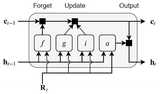 An LSTM layer works with a time series (in this case, either residuals or ) with m features and S time steps as input to the layer. Here, and correspond to the cell state and the hidden state with D units at time step t (flight), respectively. The cell state retains learned information from previous steps, while the hidden state is the output of the LSTM layer at a given time step. The first LSTM block receives the initial state and the first time step (vector of residuals) to produce the first output and the corresponding updated cell state. At step t, the output and the cell state are computed using the previous network state ( and ) and the next sequence step. At each time step, the LSTM layer adds or deletes information from the cell state through internal elements called gates, as shown in Figure 6. The forget gate f controls which information should be retained or discarded. The input gate i controls the level of cell state update. The cell state can be updated with the generated gate outputs. The output gate o decides what the next hidden state will be. After being computed, both the new and the new are carried over to the next time step. The gates ensure that only relevant information is transmitted through the sequence chain, resulting in improved predictions.