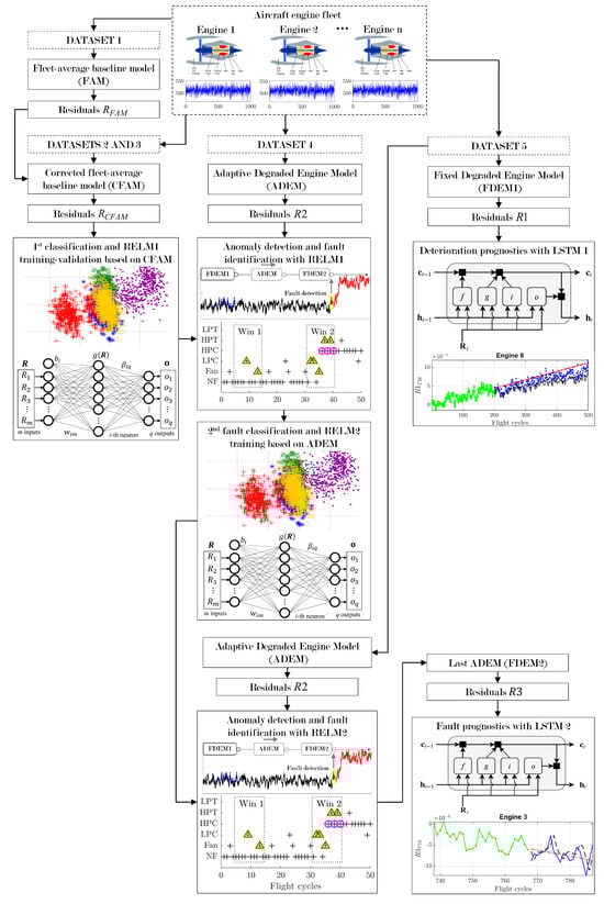 Figure 4. Creation of FDEM and ADEM for computing different residuals over the intervals of analysis. - Interval 3 (). When a fault is detected, FDEM2 (the last ADEM) remains the same throughout Interval 3 to compute residuals . As before, the same type of deep neural network is employed to predict the behavior of the fault, which evolves along with the deterioration. In practice, the fault prognosis analysis should be performed within a short period in order to take rapid maintenance actions. When an engine presents no faults or only small faults that are impossible to detect and identify, the monitoring system remains in active operation to the end of the engine’s service life.