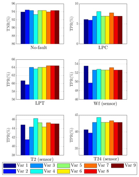 True positive rates (TPR) and true negative rates (TNR) of all fault detection variations for six health conditions.