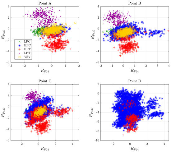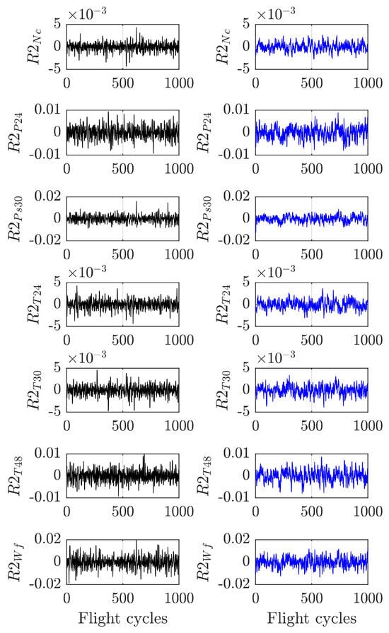 where is a matrix of size for f total consecutive flight cycles and t terms that combine elements from a vector of four operating conditions set by ambient and control variables (see Table A1), while is a matrix of size of m measured variables corresponding to a standard measurement system (see Table A2). After obtaining the coefficients x, a baseline function for all measured variables is determined as . The residuals are then computed as relative differences between the actual measured values and the baseline values .