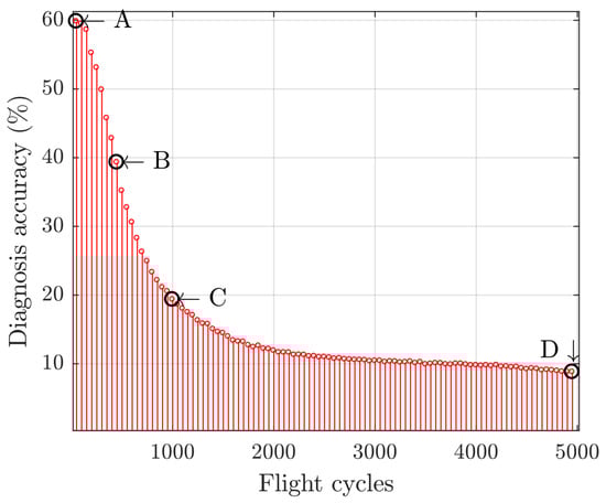Datasets 2 and 3 were generated with the same characteristics, and were intended for constructing a training set and a validation set, respectively. Together, they constituted the first fault classification used for training and validating a preliminary classification network (RELM1) with corrected residuals using CFAM. The datasets had the same size. and each of them contained 95,000 flights (19 fault conditions × 100 engines per condition × 50 flights per engine), from which 19,000 were used for residual correction with the first ten flights in each engine and 76,000 were used for diagnostics. Because the number of flights for each engine was only 50, the level of deterioration was randomly selected through ProDiMES. In this way, RELM1 was trained with a representative classification containing all 19 health conditions and with different levels of deterioration that are possible in the fleet. As an important remark, RELM1 does not solve the problem of reduced recognition accuracy due to the baseline model’s inadequacy in long-term diagnostics; however, it can assist in recognizing fault conditions from the beginning of monitoring analysis and during the first implementation of the ADEM-based procedure. The optimal network training configurations were found by the trial-and-error method, with different architectures tested to obtain the one with the highest classification accuracy value. For RELM1, the network size was 7 (measured variables as inputs) × 6000 (hidden neurons) × 19 (fault scenarios as output neurons), = 0.4493, the size of output layer weight matrix was 19 classes × 6000 hidden neurons, and the size of target matrix was 19 classes × 76,000 samples.