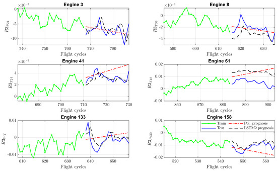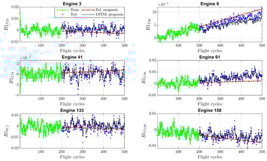 Dataset 5 had the same structure and size as Dataset 4, and was intended for validating RELM2 by applying the ADEM-based procedure in the same manner as before. In addition, this dataset allowed us to compare different state-of-the-art methods, verify different approaches for long-term diagnostics, and evaluate the prognostics algorithm. In the first case, the stage of deterioration prognostics was used to train an LSTM network (LSTM1) with residuals as the inputs. Because long-term performance deterioration evolves much more slowly than a fault, the algorithm has sufficient time to collect a considerable amount of training data. LSTM1 learns to forecast the residual values of future time steps to analyze the deterioration trend and take maintenance decisions if the residual has surpassed a given threshold value. As a reminder, both the residuals and for an engine are computed flight-by-flight, meaning that the anomaly detection–fault identification algorithm and the deterioration prognostics algorithm work simultaneously. When a fault is detected, deterioration prediction is switched to fault prognostics. Residuals are computed using the last updated ADEM, and serve as inputs to train a second LSTM network (LSTM2) and predict the evolution of the fault, which contains the influence of the accumulated deterioration. In contrast to LSTM1, LSTM2 is expected to work within a short interval. Our proposed network architecture for LSTM1 used the following parameters in each layer: (1) sequence input layer (input size = 7); (2) LSTM layer (number of hidden neurons = 800, state activation function = tanh, gate activation function = sigmoid, size of the hidden state vector = 800 × 1, size of the cell state vector = 800 × 1, size of the input weight matrix = 3200 × 7, size of the recurrent weight matrix= 3200 × 200, size of the bias vector = 3200 × 1); (3) fully connected layer (input size = 800, output size = 7, size of the weight matrix = 7 × 800); (4) regression output layer (loss function = mean squared error). Other training specifications were: number of iterations (epochs) = 600; gradient threshold = 1; initial learning rate = 0.01; learning rate drop period = 125; and learning rate drop factor = 0.2. For RELM2, the same parameters were considered in each layer, with the only differences being that the number of hidden neurons = 200, the size of the input weight matrix = (4 × 200 neurons) × 7 (from the concatenation of the four gate matrices), the number of iterations = 200, and the initial learning rate = 0.005.