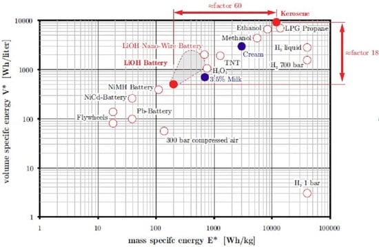 In Figure 1, a synthetic overview is presented regarding the energy density of various storage systems. Concerning the volumetric energy density, modern Li-Ion batteries are approximately 1/18th of the energy density of kerosene, while the mass energy density of these batteries is approximately 1/60th. From this perspective, batteries exhibit a clear disadvantage [3].