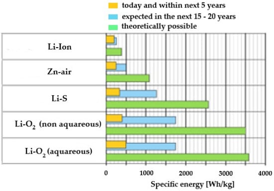Regarding batteries, recently, a state-of-the-art technology based on lithium-ion batteries offered the highest energy density, around 200 Wh/kg, with prospects of reaching 250 Wh/kg, which is still insufficient for commercial flight. The most promising directions lie in lithium–Sulfur and lithium–Oxygen batteries. In theory, these batteries can achieve energy densities between 2500 and 3500 Wh/kg. These energy densities could potentially meet the requirements for commercial aviation up to the regional transport level. A summary of the research status and prospects for these batteries is presented in Figure 2, adapted from [3].