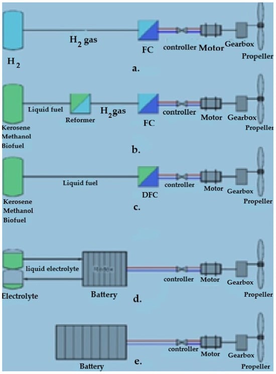 In Figure 3 [3], we present five possible architectures for electric propulsion systems. The final part of these systems is the same (controller, motor, gear, and propeller). Different are the power sources feeding the controller. The first three versions use fuel cells, fueled either with hydrogen or liquid fuel. The simplest version (Figure 3a) uses directly hydrogen in the fuel cell, but we saw that the necessary hydrogen tanks are bulky. High energy densities are provided by liquid fuels such as kerosene, methanol, or bio-fuels. Using these fuels involves converting these fuels into hydrogen with a reformer (Figure 3b) or liquid-fueled fuel cells (Figure 3c). Fuel cells with liquid fuel are not yet well developed. Systems with liquid fuel conversion to hydrogen are already commercial for ground applications, but the reformer is very heavy, and this kind of system is not yet suited for aviation [39]. The last two versions in Figure 3 used different battery types, either with liquid electrolyte (Figure 3d) or classical ones (Figure 3e).