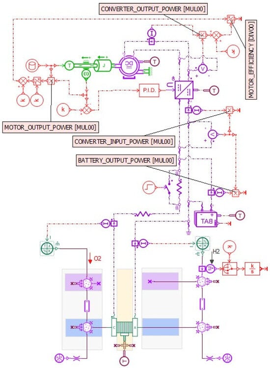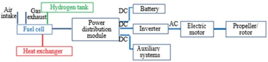 A more detailed structure of the propulsion system provided with hydrogen fuel cells is shown in Figure 4. There are also the auxiliary components along with the motor, inverter, and fuel cell.